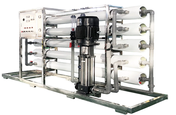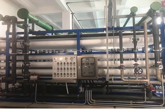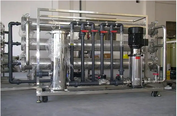 水經加阻垢劑送入精密過濾器,防止預處理中,新產生的大于五微米的懸浮顆粒,進入反滲透系統造成破壞,加壓后的水送入一級反滲透膜,泵出口設有電動慢開閥門防止膜組件受高壓水流的沖擊,進口是由低壓開關,壓力低時報警及停動,高壓管路上設有高壓開關壓力高時報警及停泵。